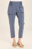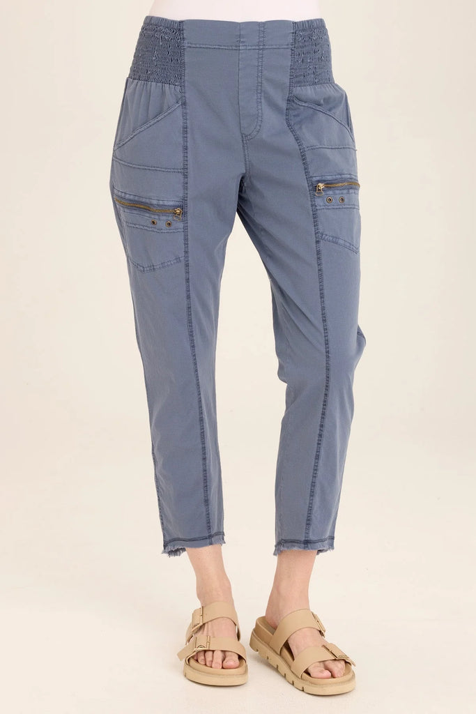 An ankle length slim fit pant with a pull on waist that features shirred panels, two inseam pockets, two patch zippered pockets, and a raw edge rounded hem.