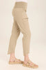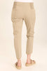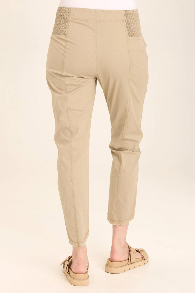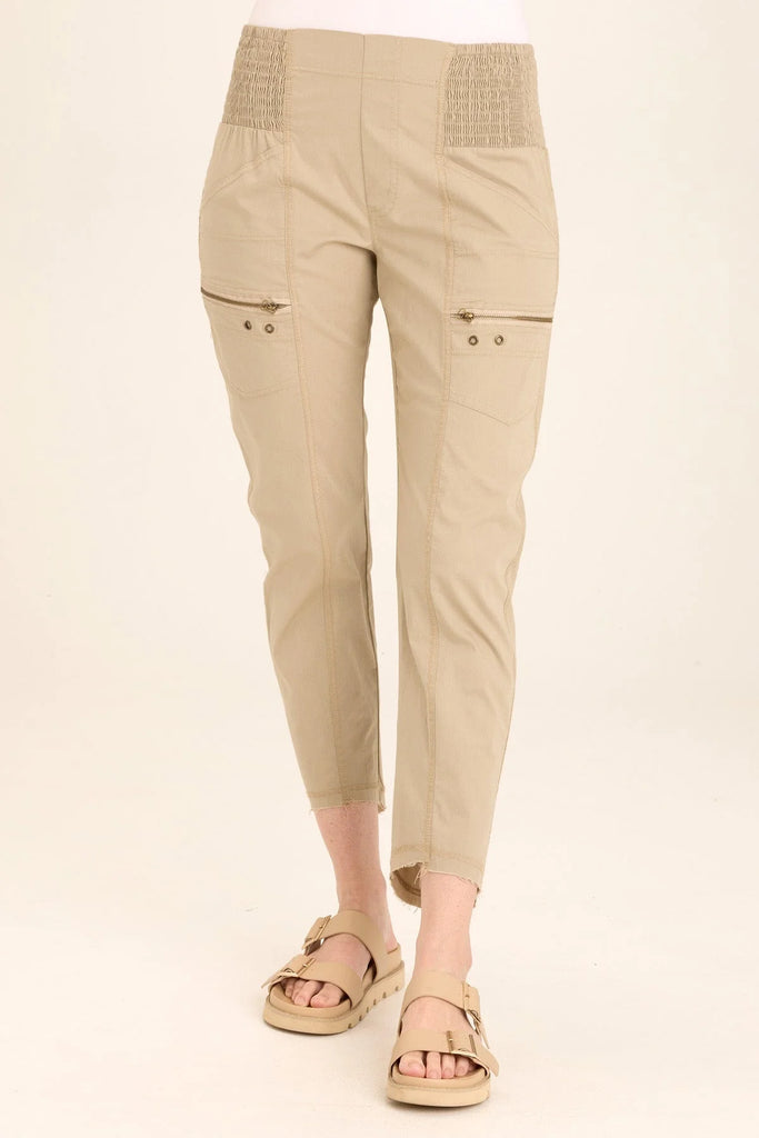 An ankle length slim fit pant with a pull on waist that features shirred panels, two inseam pockets, two patch zippered pockets, and a raw edge rounded hem.