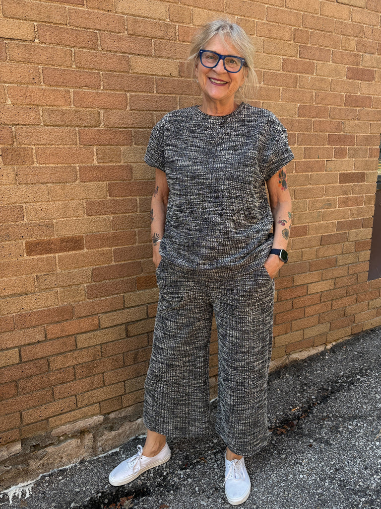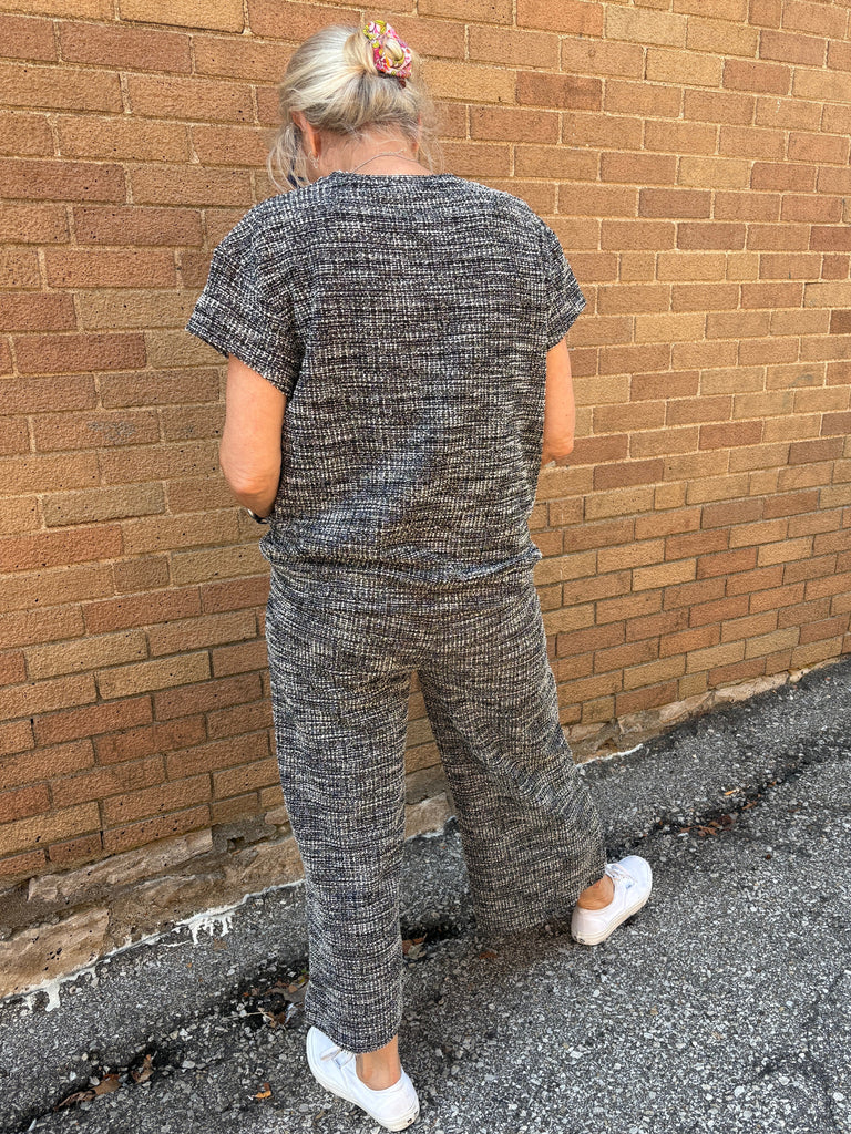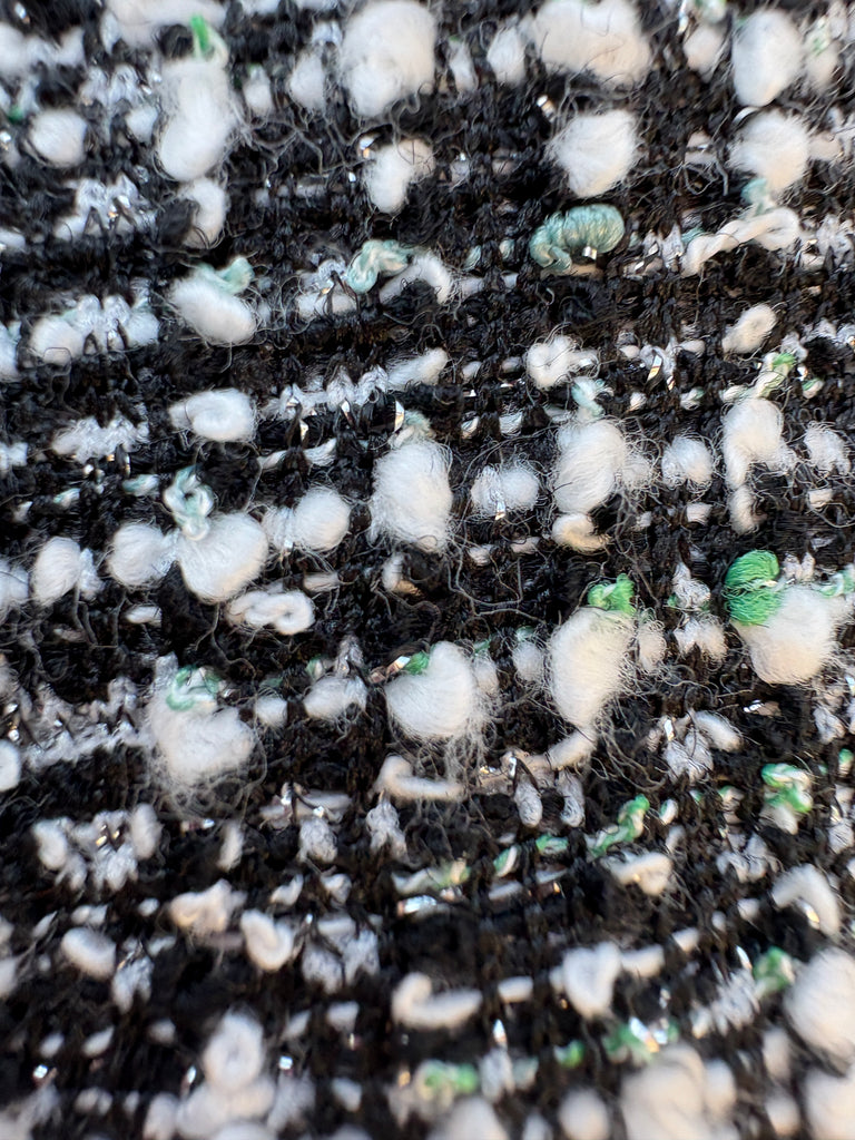 A put together look from head to toe, this boucle fabric is black and white with the tiniest hints of kelly green to add dimension! Pairs perfectly with our BOUCLE TEXTURED TOP