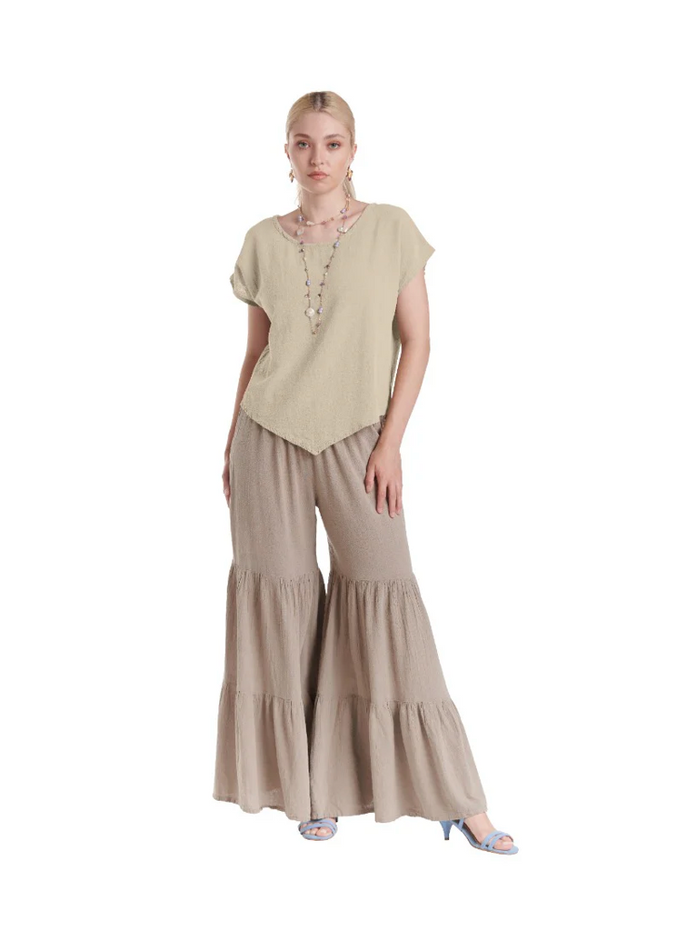 A casual cotton gauze T-shirt, designed for comfort, versatility, and effortless layering. The delicate point detail at the bottom adds a touch of feminine charm.