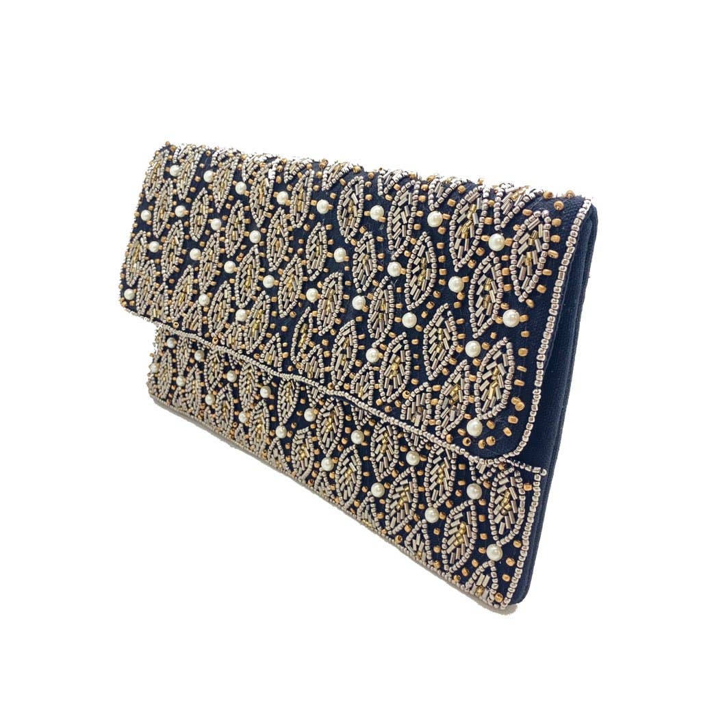 BLACK WITH PEARL PATTERN BEADED CLUTCH