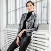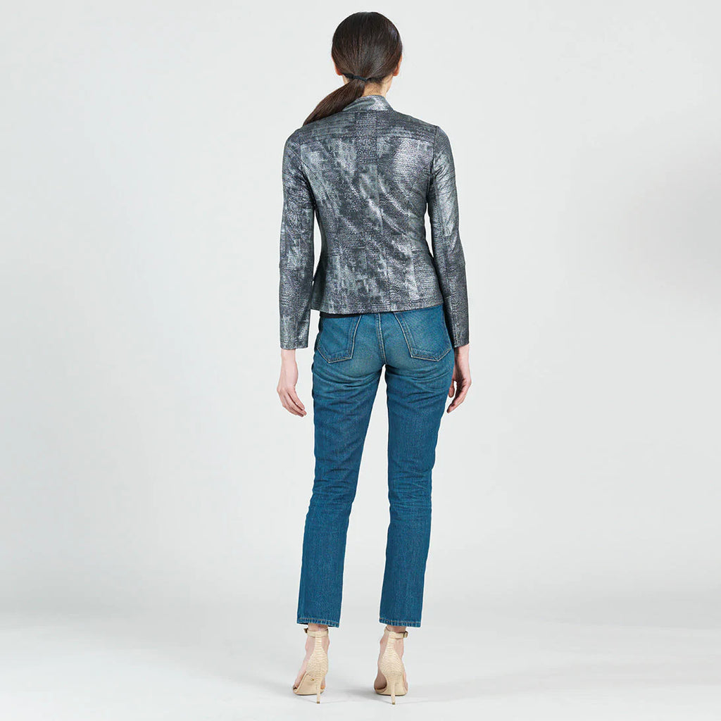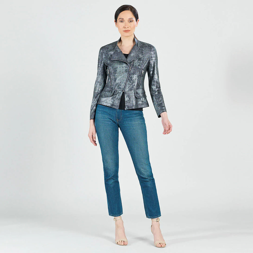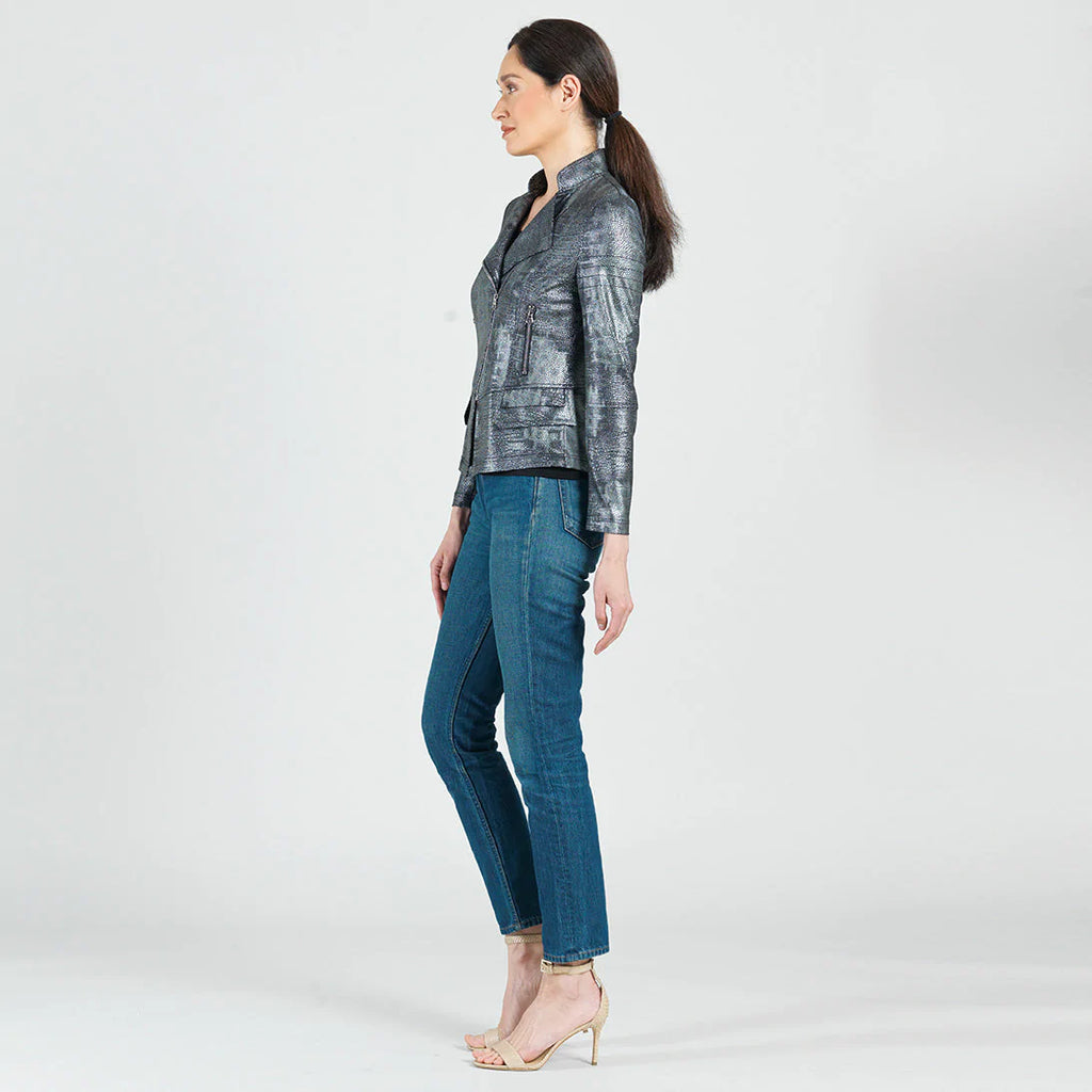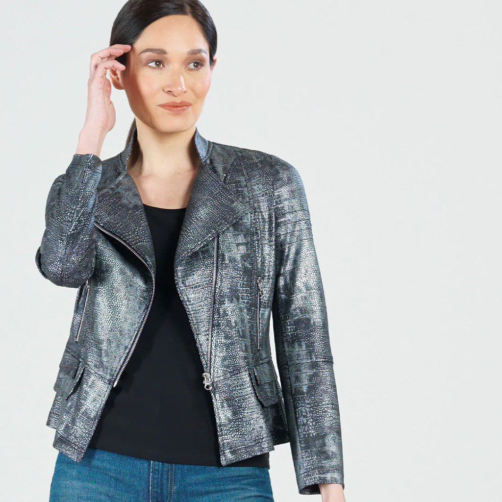 When innovation is combined with an edge you'll be sure to see our Metallic Liquid Leather Biker Jacket! This unique design is made from our beautiful signature stretch knit, extremely lightweight soft "lambskin feel" fabric with a soft, textured metallic shimmer finish. This jacket features a notched lapel with upright collar, long sleeves with upper arm stitching, a silver asymmetrical waist zip-up closure, faux pocket zipper slits, and peplum waist seam with structured double-tiered flaps, as well as curved and vertical back seams that provide a more shaped and slender silhouette... and best of all it's vegan friendly!
