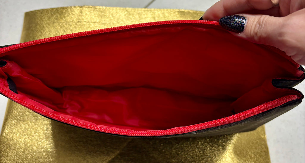 Beautifully embroidered skyline on stylish 100% cotton canvas makeup bag. Each bag is lined with red waterproof washable lining. Zipper has a nice red pull to open and close the bag.