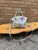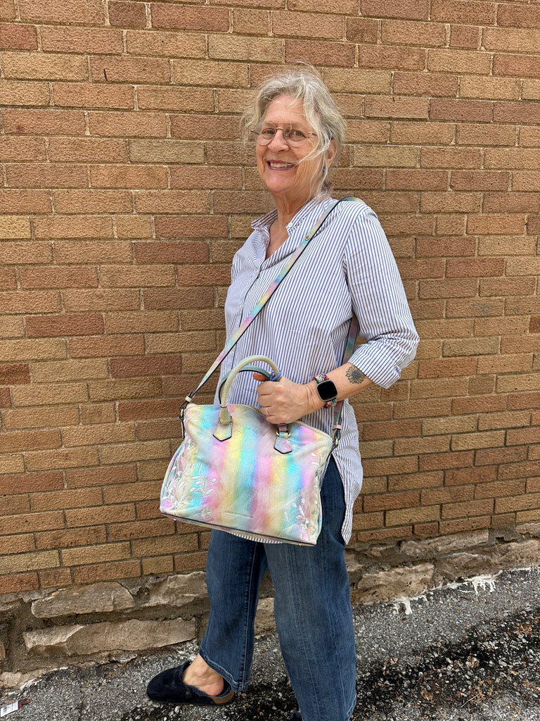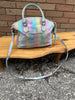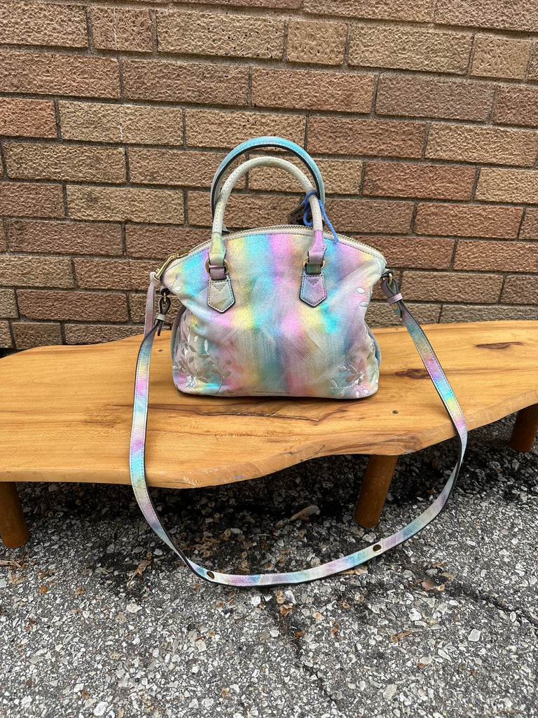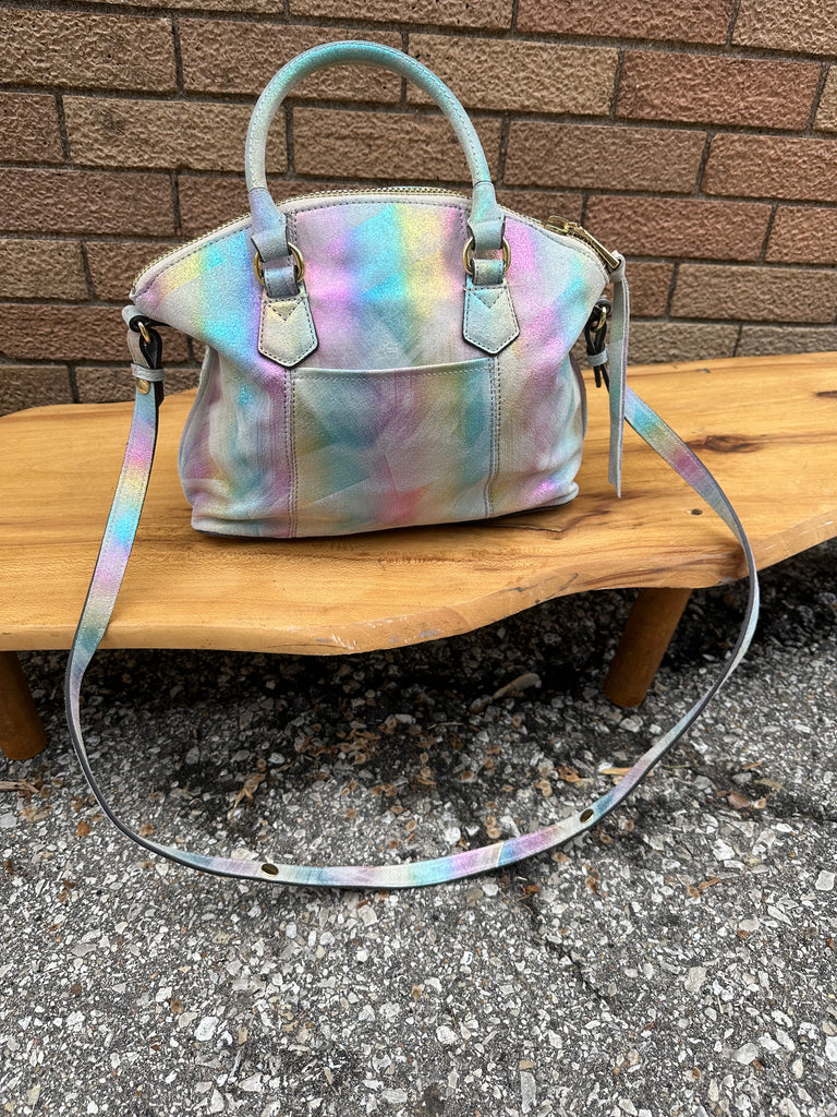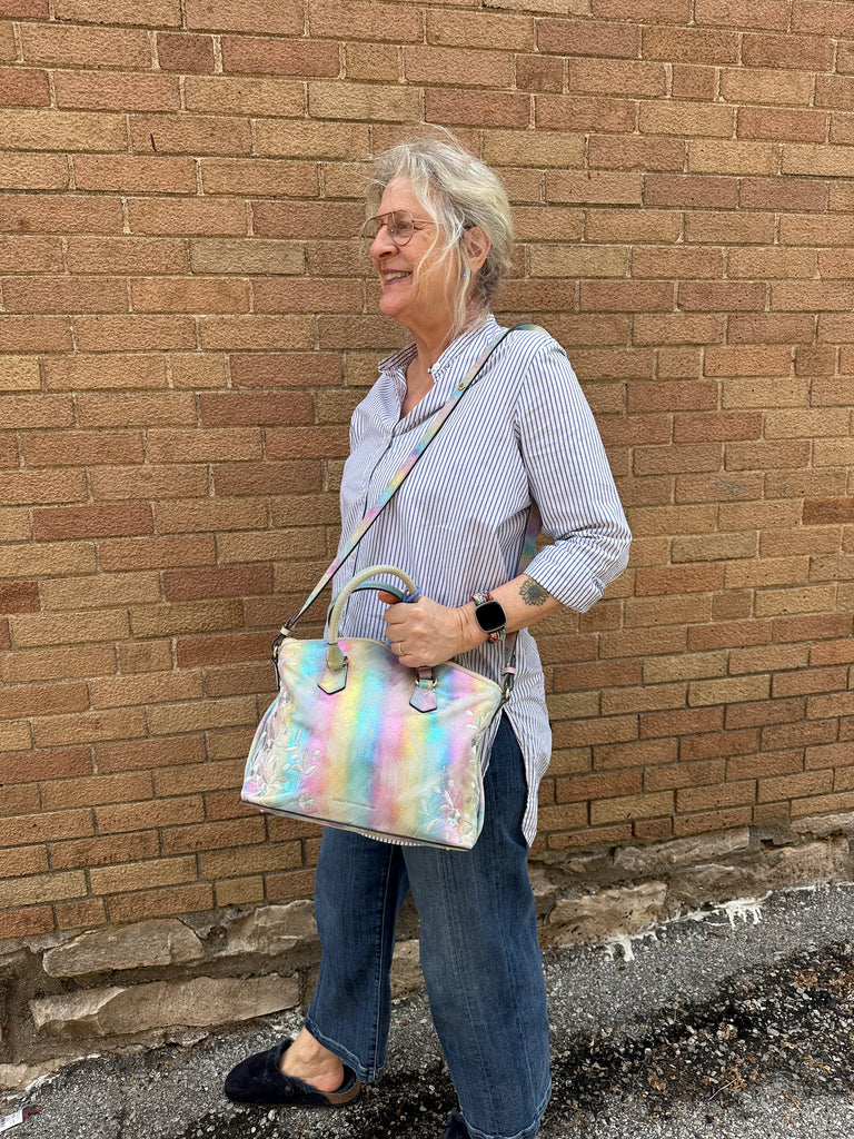 A domed shape and bright embroidered pattern make this a fun go-to bag.