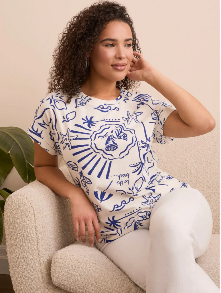 Refresh your wardrobe with this effortlessly cool T-shirt, designed with a classic crew neckline and a relaxed fit. A bold print and chic cap sleeves bring modern flair, while soft-touch cotton keeps it breathable and comfortable. Finished with subtle ladder tape detailing at the shoulders for a stylish edge.