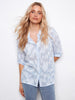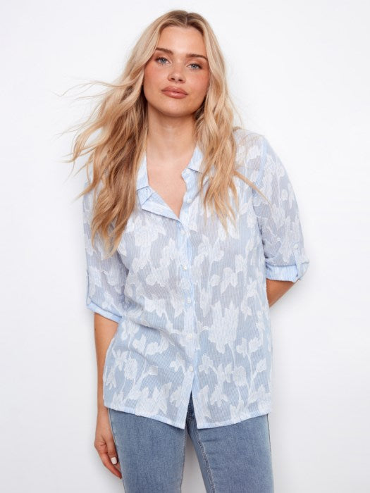 3/4 Roll Up Sleeve Embroidered Yarn Dyed Stripes Blouse