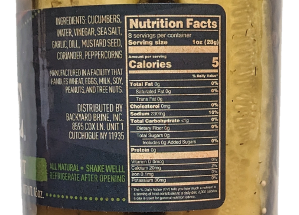 Ingredients: cucumbers, water, vinegar, sea salt, garlic, dill, mustard seed, coriander, peppercorns.