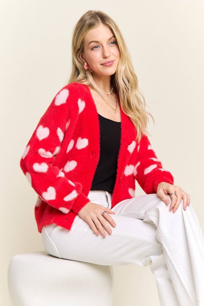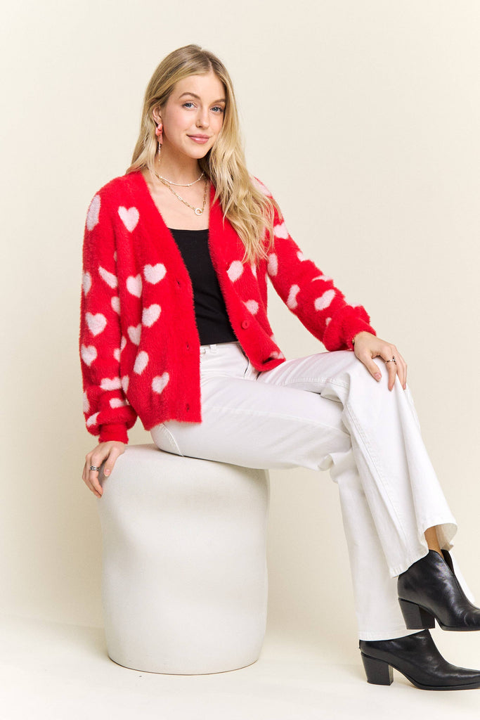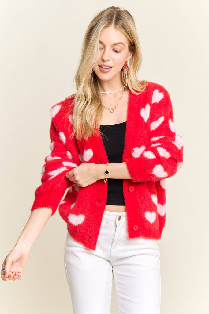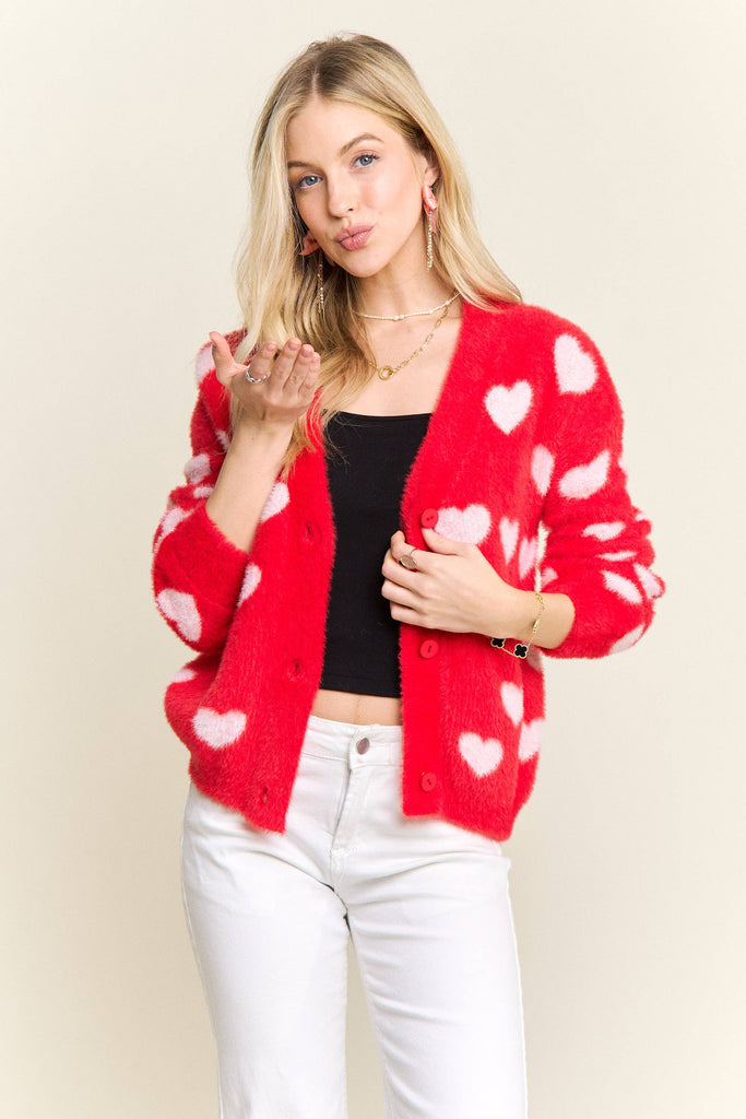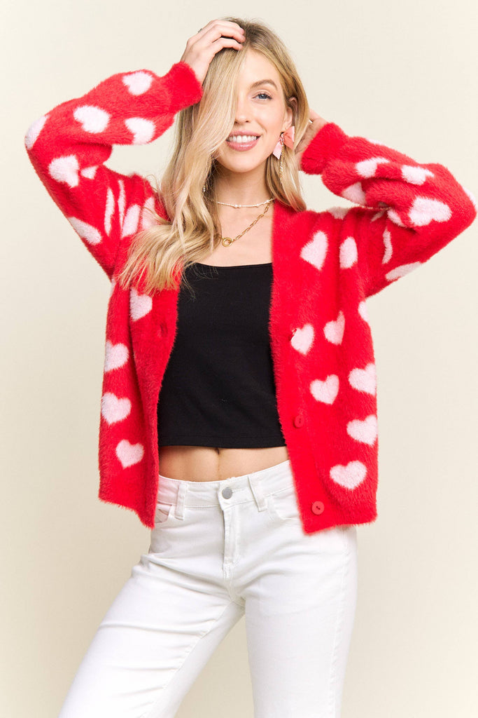 Discover the perfect blend of comfort and personality with this adorable fuzzy heart cardigan. Constructed from 75% acrylic and 25% cotton, it delivers a cloud-soft texture that feels amazing against your skin while providing gentle warmth for cooler weather. The charming heart motif scattered throughout brings instant joy to your everyday style, and the button-front silhouette makes it incredibly versatile for layering. Whether you're dressing up a simple tee or throwing it over a dress, the relaxed fit moves with you all day long. This is the cardigan you'll reach for again and again—the one that makes getting dressed feel like a little act of self-care.