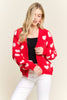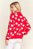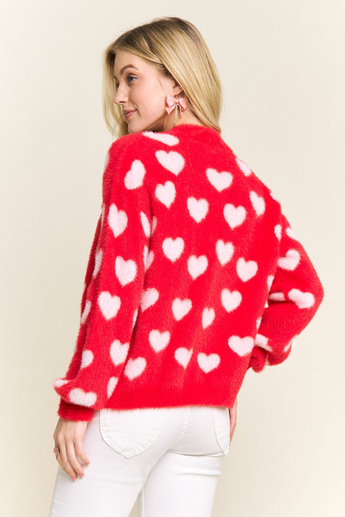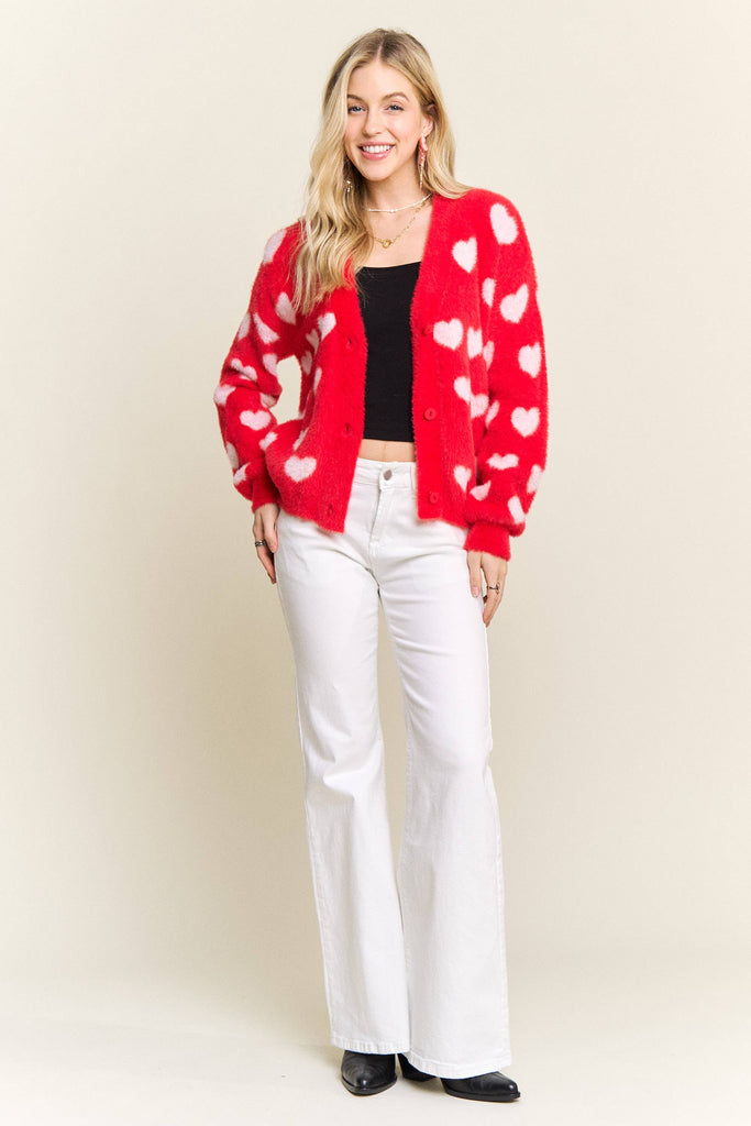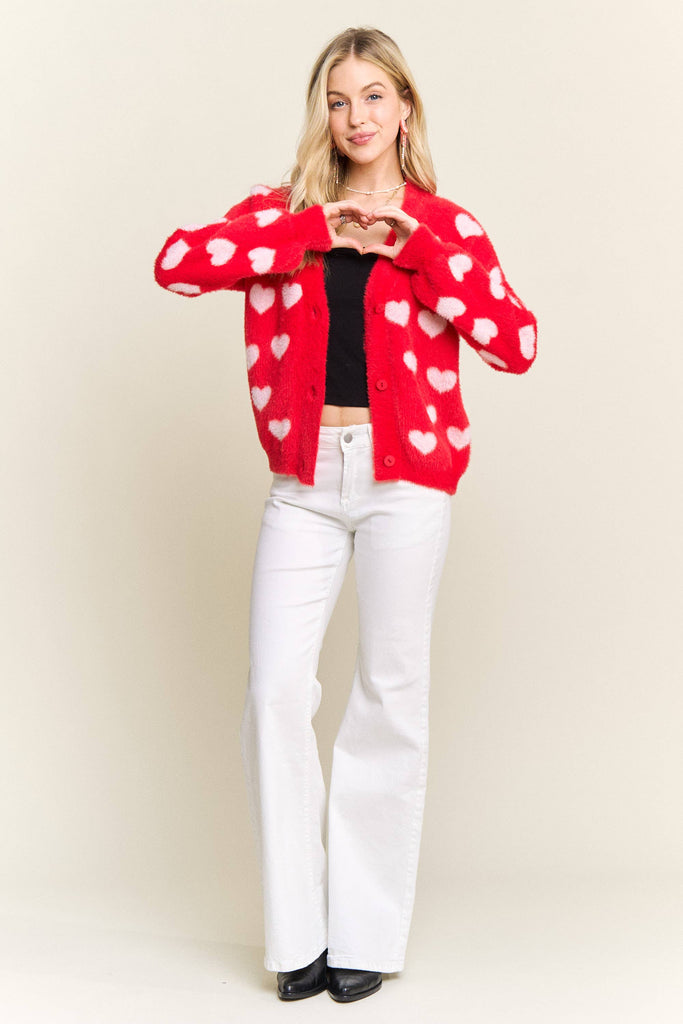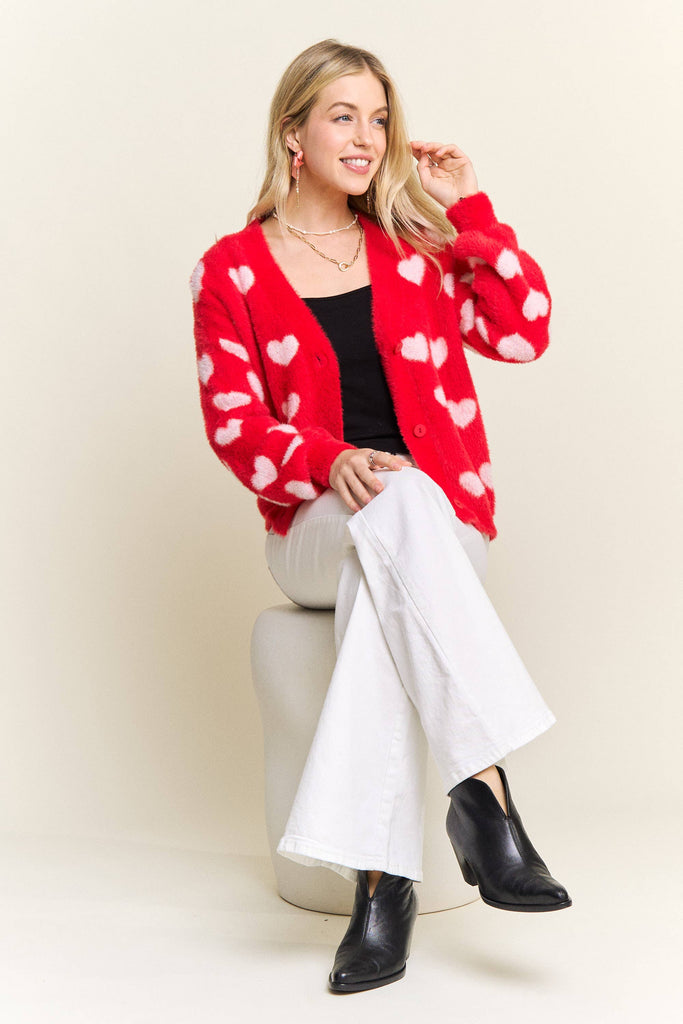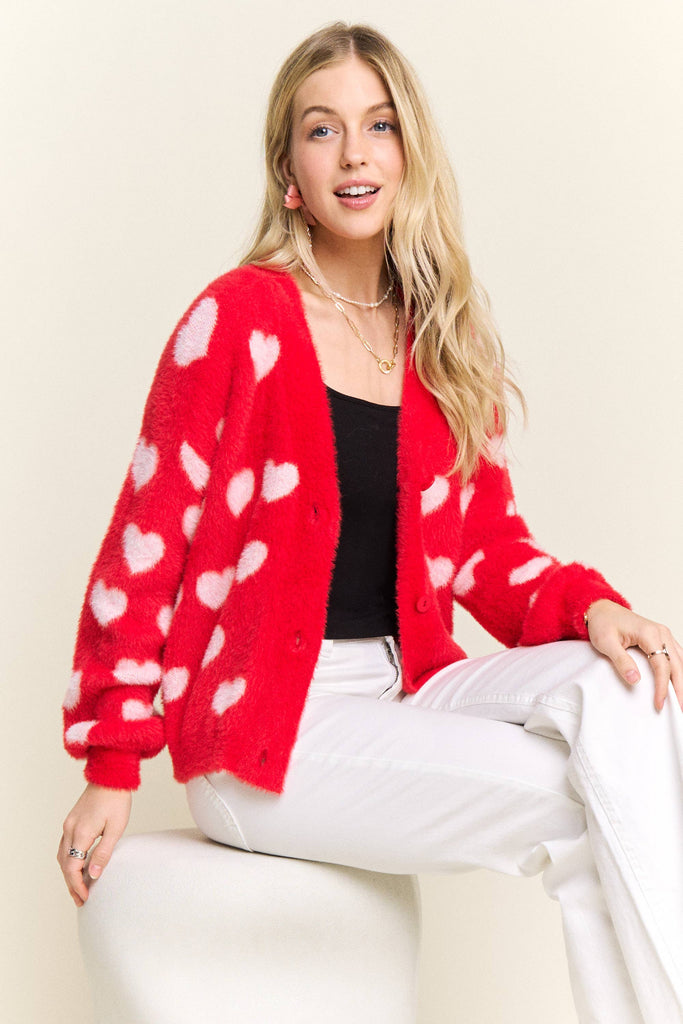 Discover the perfect blend of comfort and personality with this adorable fuzzy heart cardigan. Constructed from 75% acrylic and 25% cotton, it delivers a cloud-soft texture that feels amazing against your skin while providing gentle warmth for cooler weather. The charming heart motif scattered throughout brings instant joy to your everyday style, and the button-front silhouette makes it incredibly versatile for layering. Whether you're dressing up a simple tee or throwing it over a dress, the relaxed fit moves with you all day long. This is the cardigan you'll reach for again and again—the one that makes getting dressed feel like a little act of self-care.