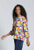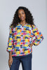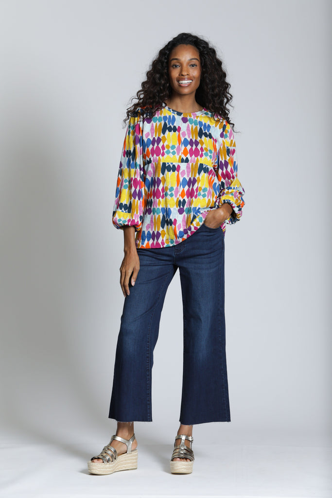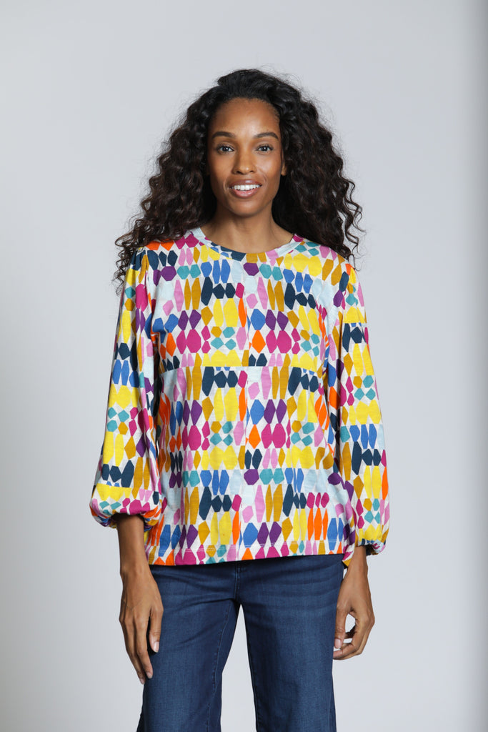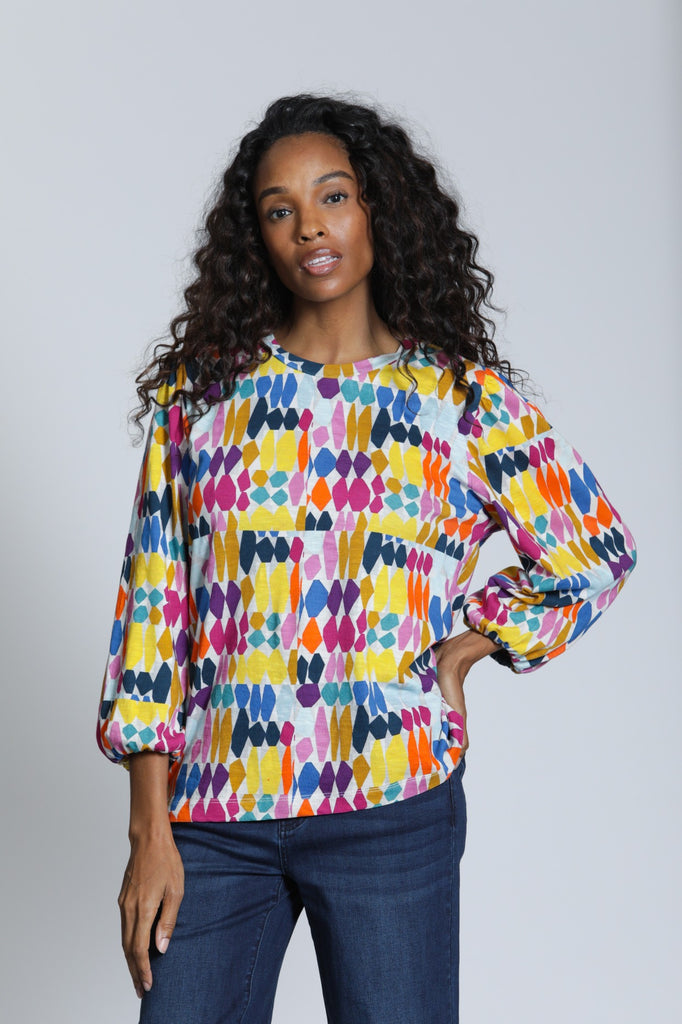 Brighten your everyday wardrobe with the Painted Pebbles Puff Sleeve Top, featuring a vibrant geometric mosaic print in bold pops of yellow, magenta, and indigo. This artistic top is designed with a classic round neckline and a clean straight hemline for a versatile, relaxed fit. The look is finished with stylish long puff sleeves that gather at the shoulder and end in comfortable elasticated cuffs, adding a touch of feminine flair to this colorful statement piece.