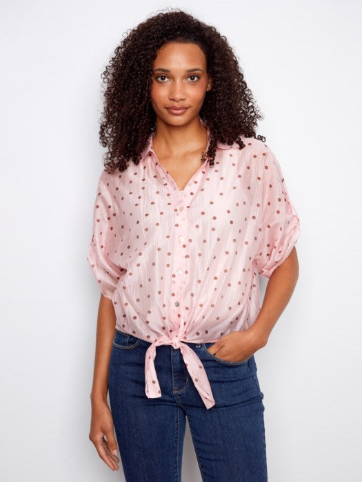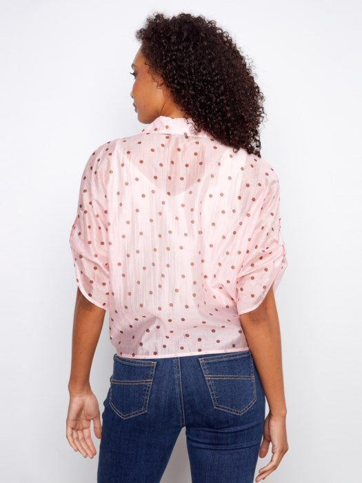 Printed Roll Up Dolman Elbow Sleeve Front Tie Blouse