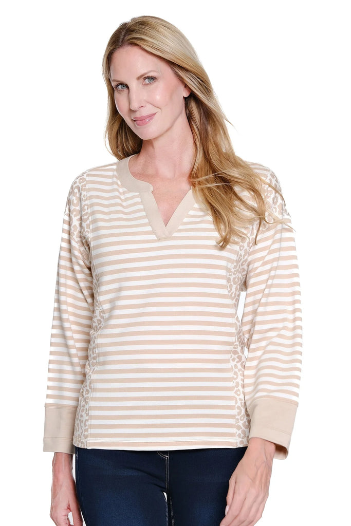 This versatile knit top combines relaxed comfort with standout style. Designed with a drop-shoulder silhouette and cuffed 3/4 sleeves, it features a clean band collar for a polished finish. Offered in solid, yarn-dyed stripe, and animal print options, this soft, stretchy knit top easily transitions from casual days to elevated everyday looks.