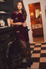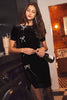 Short sleeve velvet mini dress adorned with pearl bow embellishments at the side front. Total Length: 36"