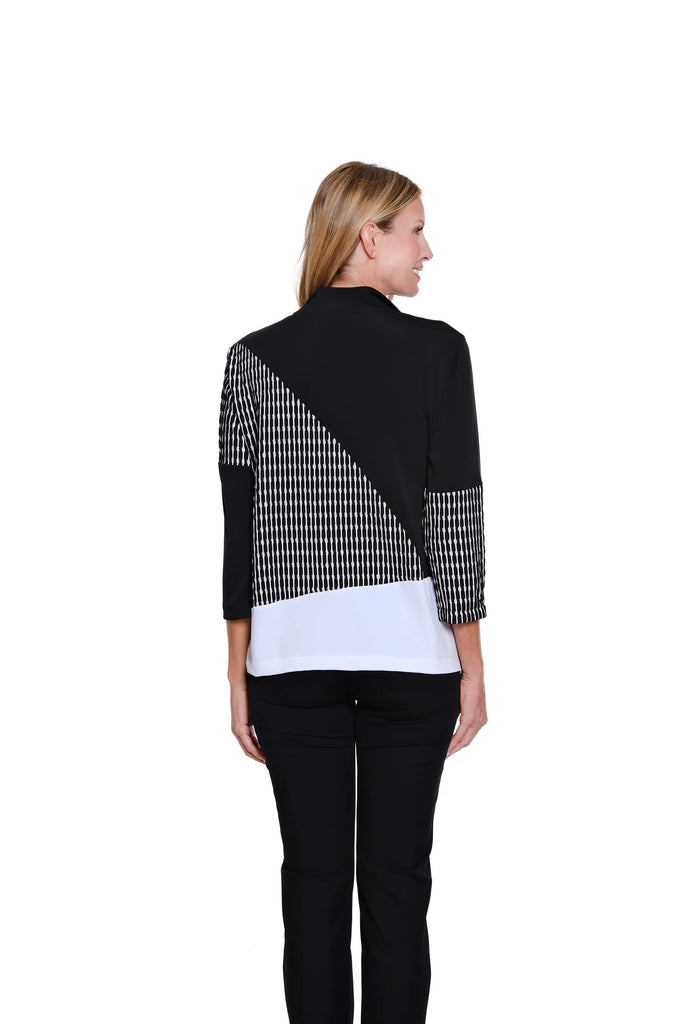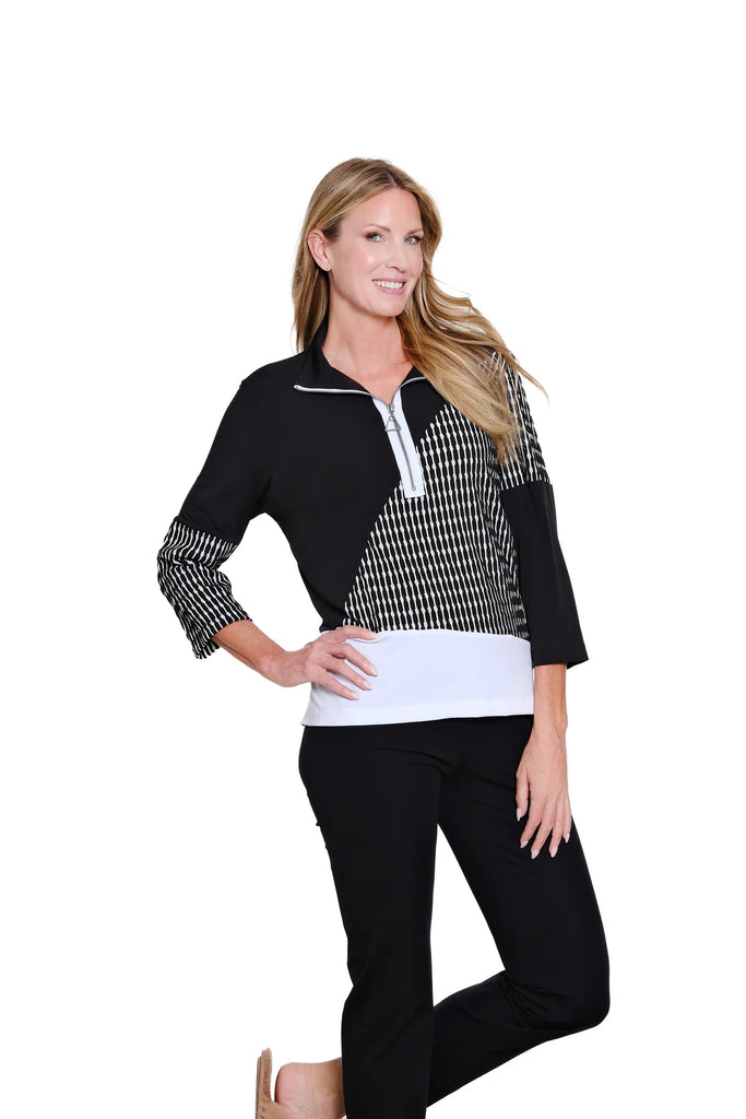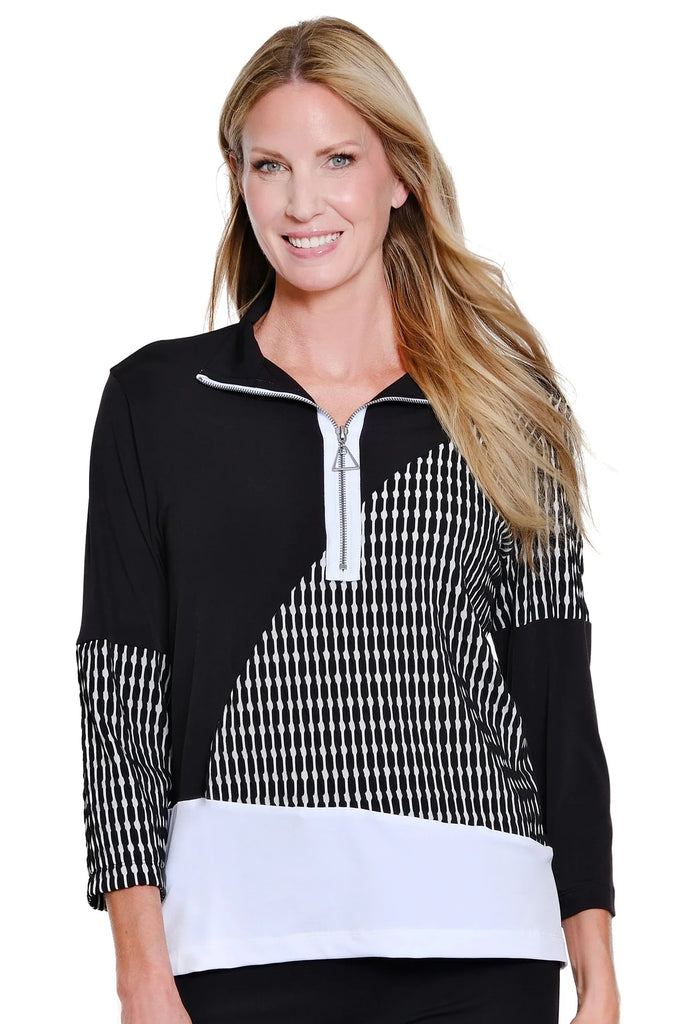 Distinctively designed with a mix of solid and yarn-dyed stripe panels, this wave knit top brings subtle movement and contemporary interest to an easy silhouette. The zip-through collar allows for adjustable styling, adding both function and modern edge. Finished with 3/4-length sleeves and crafted in a comfortable poly-spandex blend, it offers stretch, structure, and effortless everyday sophistication.